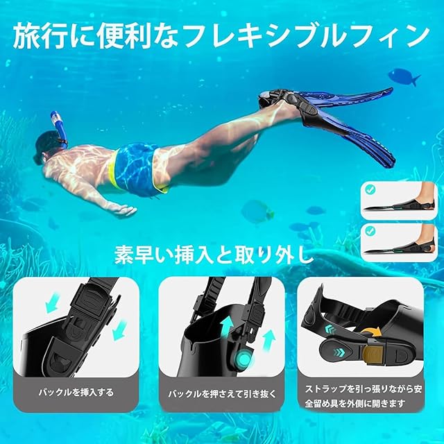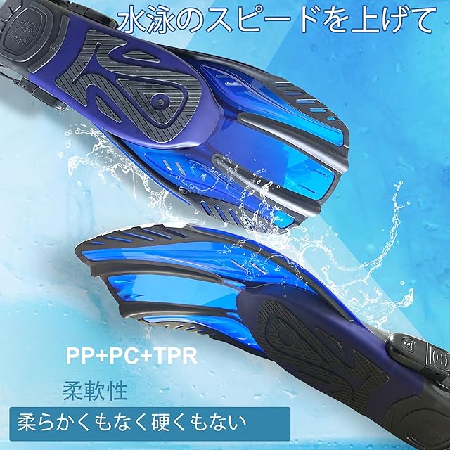 通気性、排水可能、滑り止めのフィン : 長いタイプより大きすぎず、小回りが利いて使いやすくて上級者にも初心者にも向けです。足の指と甲を露出するデザインで排水しやすい構造になり、水を流すための丈夫なサイドレールと、自然なキックのために予め曲げられて、キックの頻度を高め、推進力を向上させ、少ないキックでもしっかりとした推進力があります。長く泳げ、シュノーケリングが楽しめます。