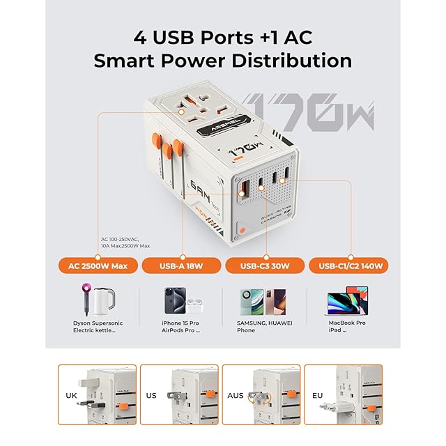 【170W GaN急速充電|5台同時充電対応】 最先端GaN(窒化ガリウム)技術を採用し、合計最大170Wの高出力を実現!3つのUSB-Cポート&1つのUSB-Aポートを搭載し、ノートPC・スマートフォン・タブレットなどを高速かつ効率的に充電可能。さらに、ユニバーサル対応プラグ搭載で、海外旅行・出張・デジタルノマドに最適な必携アイテム!