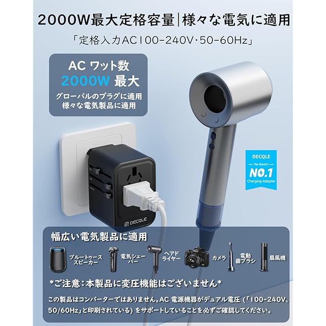 [ACコンセントの定格入力] 本製品の定格入力はAC100-240V、50-60Hzです。また、定格容量「または消費電力:W(ワット)数」は最大2000Wであり、高出力の電気製品に適用しています。ヘアドライヤー、カメラ、電動歯ブラシ、扇風機、シェーバーなどの様々な電気製品に当て嵌ています。※「ご注意」本製品に変圧機能はございませんので、ご使用の際は必ず電圧をご確認ください。また、炊飯器、ヘアドライヤーなどの高出力電気製品を長時間に使用する場合は、過熱や過負荷の恐れがあるますので、高出力電気製品をご使用の際にご注意してください。