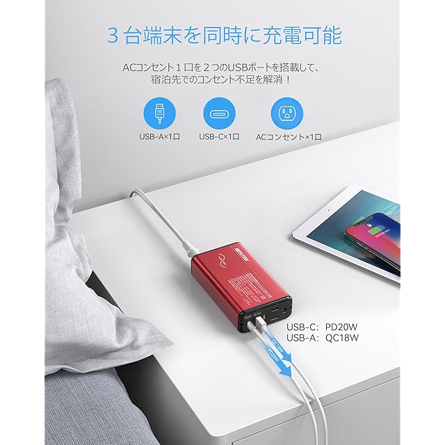 ダウントランス変圧器 - AC100VとDC12Vに変圧してAC家電製品とDC電子機器のいずれも対応可能です。ACコンセント 1口とUSB-C PD20W 1口とUSB-A QC18W 1口で様々な電子機器が同時に充電可能で、宿泊先でのコンセント不足を解消できます。ACとDCの電源出力は完全分離で、使用状況を示すLEDライトと内蔵ヒューズが付いており、また過負荷、過熱、短絡の保護機能がありますので安心してご使用いただけます
