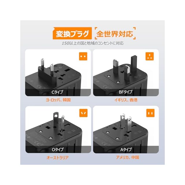 商品名:TESSAN 海外用変換プラグ 全世界対応 C/BF/O/Aタイプ変換 マルチ海外コンセント USB-A2口 USB-C2口 韓国 イギリス アメリカ オーストラリア ヨーロッパ 旅行用便利グッズ ブラック