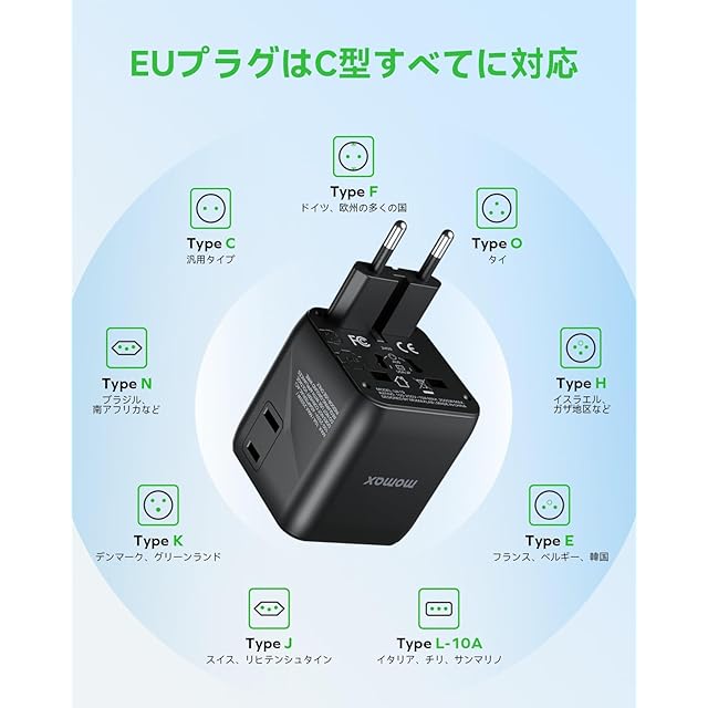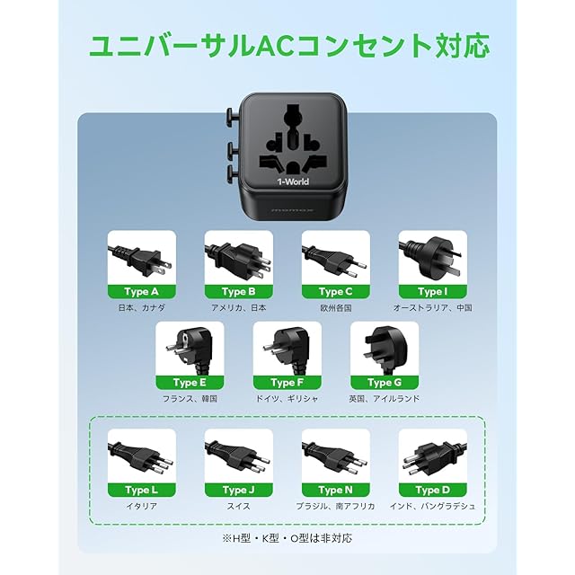 【全世界対応の変換プラグ】MOMAXの海外変換プラグは、Aタイプ、Oタイプ、Cタイプ、BFタイプの4種類のコンセント形状に対応しています。これ1つでヨーロッパ/アメリカ/イギリス/オーストラリア/フランス/韓国/中国/シンガポールなど世界200ケ以上の国で使用できます。100-250Vの入力対応で、ヒューズの最大負荷電流は10Aです。