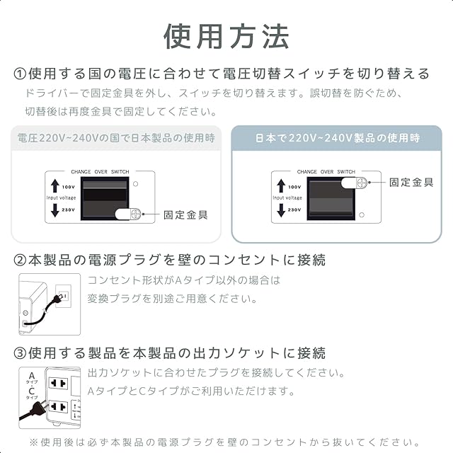AC100V(日本国内)で1500WまでのAC220~240V仕様の家電製品が使えます。
