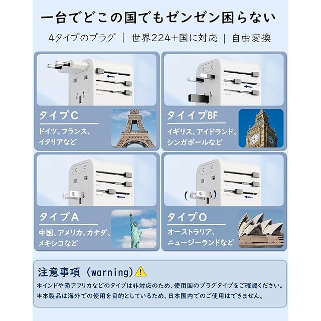 [ワールドワイドに対応] 本製品は差し込みプラグの形状を変換するための「変換プラグ」です。世界中で使用されている4タイプに対応可能です。1.タイプCはほぼヨーロッパ、2.タイイプBFはイギリス・アイドランド・シンガポールなど、3.タイプAは中国・アメリカ・カナダ・メキシコなど、4.タイプOはオーストラリア・ニュージーランドなどの224 か以上の国・地域に使えます。インドや南アフリカなどのタイプは非対応のため、使用国のプラグタイプをご確認ください。また、本製品は海外での使用を目的としているため、日本国内でのご使用はできません。
