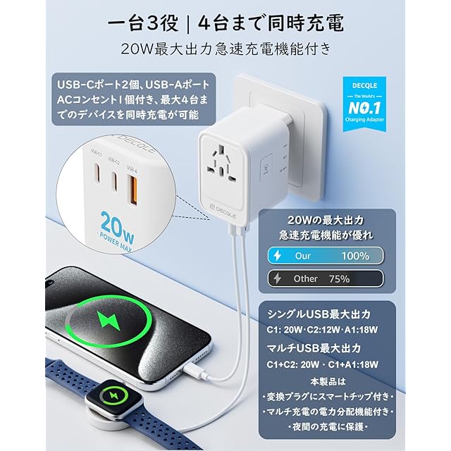 商品名:【PD20W 急速充電】 decqle 海外 変換プラグ コンセントマルチ変換プラグ 2 USB-C(PD20W 急速充電)& 1 USB-Aポート 4台同時充電 全世界対応(アメリカ/イギリス/ヨーロッパ/オーストラリア/中国などの224+国々に対応)旅行用 スマホに対応 白い