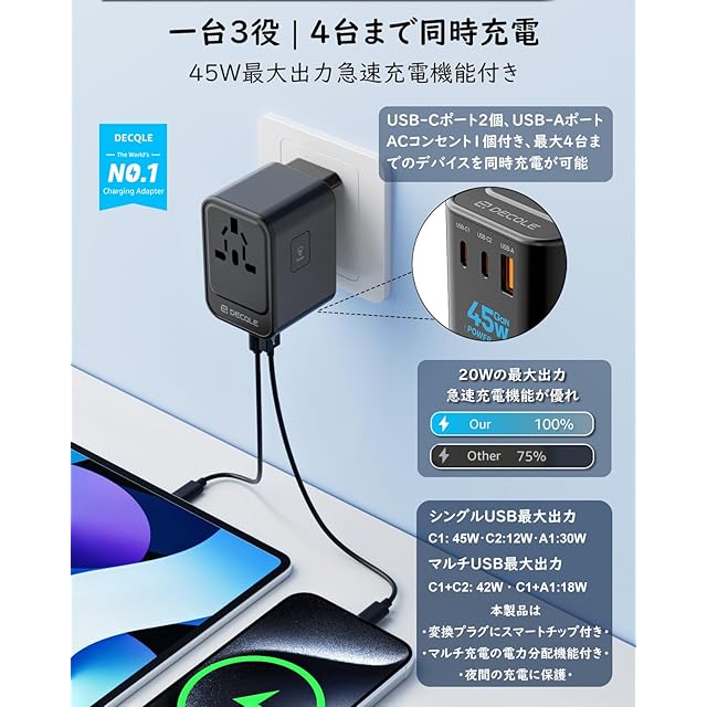 商品名:【GaN 45W 急速充電】 decqle 海外 変換プラグ コンセントマルチ変換プラグ 2 USB-C(GaN45W 急速充電)& 1 USB-Aポート 4台同時充電 全世界対応(アメリカ/イギリス/ヨーロッパ/オーストラリア/中国などの224+国々に対応)旅行用 タブレットに対応 黒い