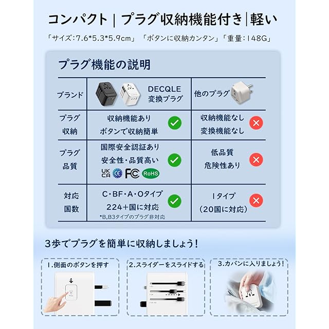 [コンパクトで軽いデザイン] 本製品はのコンパクトで軽くて、サイズは7.6*5.3*5.9cm、重さは148gで、また側面のボタンを押すと、4種類のプラグ部分を伸縮して収納可能のため、カバンやスーツケースに直接入れても重さも気にせず、海外旅行と出張の際の持ち運びにとても便利です。ハードなPCケースにより、変換プラグを落下しても内部のデバイスを保護します。