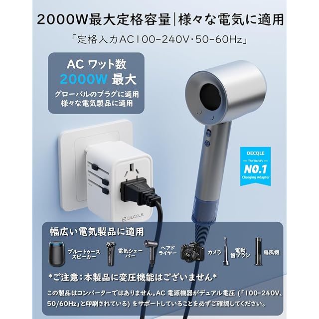 [ACコンセントの定格入力] 本製品の定格入力はAC100-240V、50-60Hzです。また、定格容量「または消費電力:W(ワット)数」は最大2000Wであり、高出力の電気製品に適用しています。ヘアドライヤー、カメラ、電動歯ブラシ、扇風機、シェーバーなどの様々な電気製品に当て嵌ています。※「ご注意」本製品に変圧機能はございませんので、ご使用の際は必ず電圧をご確認ください。また、炊飯器、ヘアドライヤーなどの高出力電気製品を長時間に使用する場合は、過熱や過負荷の恐れがあるますので、高出力電気製品をご使用の際にご注意してください。