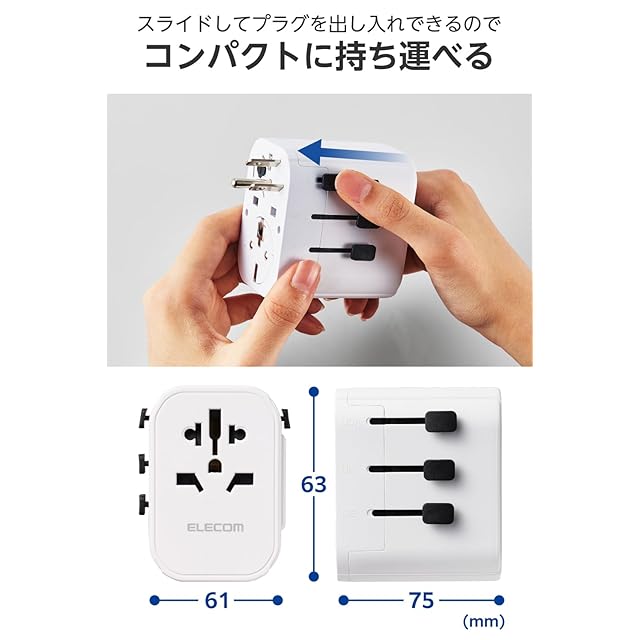 世界の主要国で利用できる4タイプ対応です。スライドで使用したい国のプラグを出し入れでき、使わないときはコンパクトに持ち運べます。