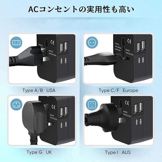 【2つのUSB-Aポート&ACアダプター搭載】:このマルチ変換プラグは、2つのUSB-AポートとAコンセントを搭載しています。USB-Aポートは2.1A充電に対応し、スマートフォンやタブレット、Bluetoothイヤホンなどのデバイスを同時に充電できます。また、ACアダプターは各国の標準的な電源コンセントに接続して、同時に最大3台をデバイスへ充電できます。旅行先のコンセントが足りない、デバイスを多くお持ちの方におすすめです。