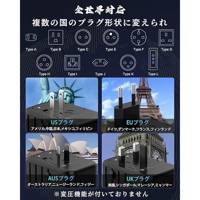 【複数の保護機能&自動リセットヒューズ内蔵】:コンセント 変換プラグが国際CE、ROHS、FCCなどの認証を取りました。過電圧、温度検知、過電流、過放電、過充電、外部ショート(短絡)保護等多いのセキュリティ保護システムが搭載しております、大事な電気安全を守ります。また、自動リセット機能付きの10Aヒューズを搭載しており、過電流や短絡が発生した場合でも、迅速に復旧可能です、ヒューズを交換する手掛けが不要です。これにより、デバイスを損傷から守り、安心して利用することができます。※USBポートと接続の場合、どの国に行っても変圧器不要です。日本国内の電気規格(PSE)を取得していないため、日本国内での使用は避けてください。
