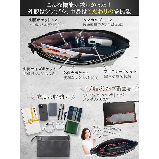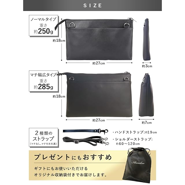 ✅【大人のたしなみ 本革クラッチバッグ】上質で厳選された本革を採用した本格クラッチバッグは、すべての企画を日本で行い機能性も充実させました。。すぐに劣化してしまうフェイクレザー(PUレザー)とは全く違った高級感で永くご利用いただける本革素材です。【サイズ】縦180㎜/横270mm/奥行30mm<BR> ✅【祝儀袋やフクサを入れるスペース!】普段あまり持ち歩かない祝儀袋が「他の荷物に紛れて折れてしまった」という事の無いよう、祝儀袋や長封筒が独立して入るスペースをご用意しました。これで受付などでも慌てることなくスムーズな対応ができます!<BR> ✅【クラッチ・ショルダーの2WAY仕様】付属の専用ストラップを2種類お付けしており、ワンタッチで2WAYの使い分けが可能です。例えば、2次会などでカジュアルな雰囲気になったらクラッチからショルダーに変更してリラックススタイルにするなど、シーンに合わせて使い分けができます。 もちろん、普段使いでショルダー利用も、ボディーバッグとしての利用も可能な万能バッグです。<BR> ✅【革の個性について】本商品は天然皮革を使用しており、「生きた証(ナチュラルマーク)」と呼ばれるバラ傷・などが刻まれている場合があり、合成皮革(PUレザー・マイクロファイバーレザー)のように人工で均一な素材ではございません。Annekorでは革の個性をお楽しみいただくため、良質な天然皮革の証であるナチュラルマークをあえて隠す加工はしておりませんが、不良品ではございませんのでご了承くださいませ。<BR> ✅【類似品にご注意ください。お買い物は日本企業で】見た目の画像は同じような商品でも、作る工場や品質・対応は全く違います。すぐに壊れる・色が画像と違う・連絡をしても返事がない等色々なトラブルがございますので、販売業者は慎重にお選びくださいませ。日本企業でのお買い物はアフターケアも充実。何かございましたら、弊社日本人スタッフが迅速に対応させていただきます。