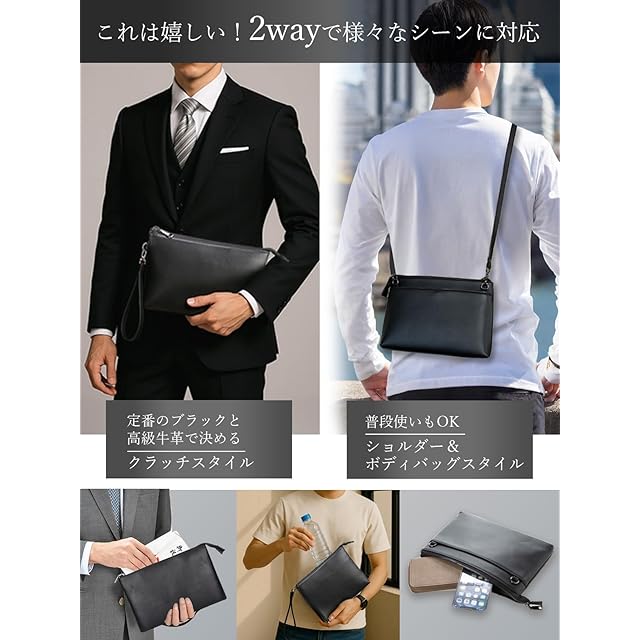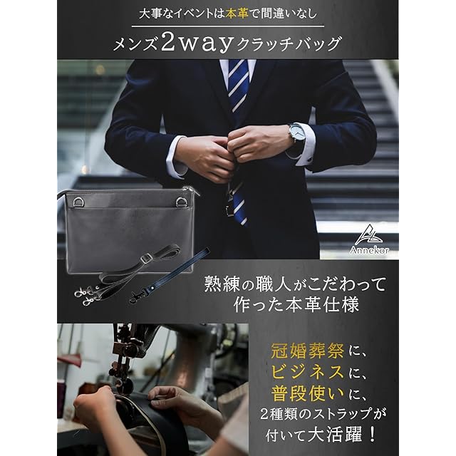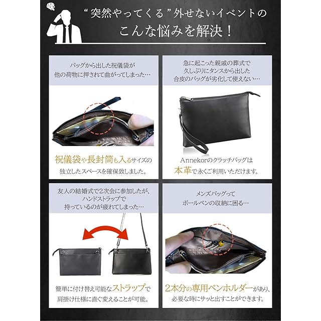 ✅【大人のたしなみ 本革クラッチバッグ】上質で厳選された本革を採用した本格クラッチバッグは、すべての企画を日本で行い機能性も充実させました。。すぐに劣化してしまうフェイクレザー(PUレザー)とは全く違った高級感で永くご利用いただける本革素材です。【サイズ】縦180㎜/横270mm/奥行30mm<BR> ✅【祝儀袋やフクサを入れるスペース!】普段あまり持ち歩かない祝儀袋が「他の荷物に紛れて折れてしまった」という事の無いよう、祝儀袋や長封筒が独立して入るスペースをご用意しました。これで受付などでも慌てることなくスムーズな対応ができます!<BR> ✅【クラッチ・ショルダーの2WAY仕様】付属の専用ストラップを2種類お付けしており、ワンタッチで2WAYの使い分けが可能です。例えば、2次会などでカジュアルな雰囲気になったらクラッチからショルダーに変更してリラックススタイルにするなど、シーンに合わせて使い分けができます。 もちろん、普段使いでショルダー利用も、ボディーバッグとしての利用も可能な万能バッグです。<BR> ✅【革の個性について】本商品は天然皮革を使用しており、「生きた証(ナチュラルマーク)」と呼ばれるバラ傷・などが刻まれている場合があり、合成皮革(PUレザー・マイクロファイバーレザー)のように人工で均一な素材ではございません。Annekorでは革の個性をお楽しみいただくため、良質な天然皮革の証であるナチュラルマークをあえて隠す加工はしておりませんが、不良品ではございませんのでご了承くださいませ。<BR> ✅【類似品にご注意ください。お買い物は日本企業で】見た目の画像は同じような商品でも、作る工場や品質・対応は全く違います。すぐに壊れる・色が画像と違う・連絡をしても返事がない等色々なトラブルがございますので、販売業者は慎重にお選びくださいませ。日本企業でのお買い物はアフターケアも充実。何かございましたら、弊社日本人スタッフが迅速に対応させていただきます。