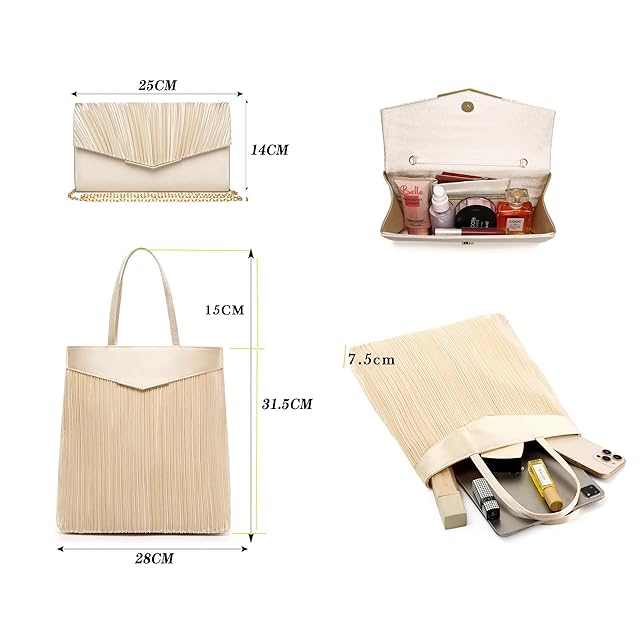 [SHIMMER] レディース 結婚式 パーティーバッグ レディース大きめ 2セット フォーマルバッグ サブバッグ 結婚式 冠婚葬祭 サテン プリーツ (シャンパン)