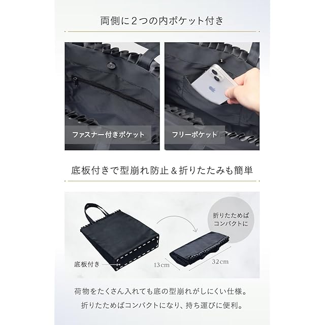【型崩れしにくく、携帯も可能|商品仕様】 [サイズ] 約 横32cm×縦39cm×マチ10cm [重さ] 約250g。取り外し可能な底板付きで、荷物を入れても型崩れしにくく、美しいフォルムを保ちます。使用しない時は底板を外してコンパクトに折りたためるので、メインバッグに入れての持ち運びにも便利です。