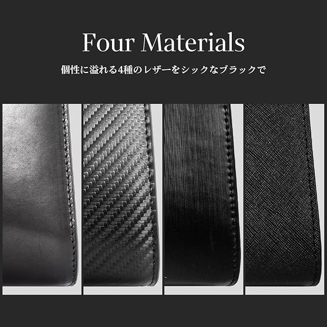 人気の4素材をラインナップ。おしゃれ、クール、カジュアル、ビジネス、フォーマルなどスタイルに合わせてお選び頂けます。 記念日 などの プレゼント 父の日 バレンタインデー ホワイトデー 誕生日 クリスマス 等の ギフト にも おすすめ です。glossblack グロスブラック(イタリアンレザー) / vinylblack バイナルブラック(バイナルレザー) / saffianoblack サフィアーノブラック(サフィアーノレザー) / carbonblack カーボンブラック(カーボンレザー)