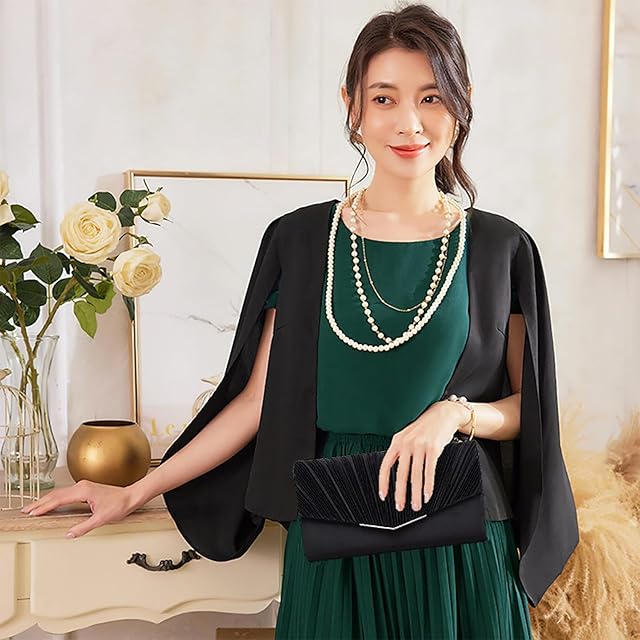 [SHIMMER] レディース 結婚式 パーティーバッグ レディース大きめ 2セット フォーマルバッグ サブバッグ 結婚式 冠婚葬祭 サテン プリーツ (ブラック)