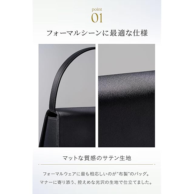 【品格が漂う、フォーマル向けの上質素材】 フォーマルウェアに最も相応しいとされる、光沢を抑えたマットな質感のサテン生地を使用。派手にならず、落ち着いた印象を与えます。流行に左右されないタイムレスで美しいデザインは、20代で初めて持つ方から30代、40代、50代のミセスまで、世代を問わず永くご愛用いただけます。