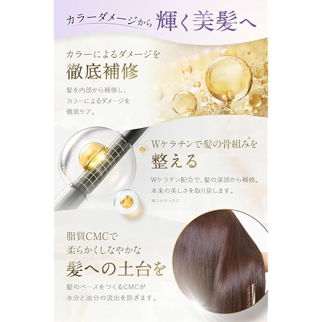 サラッとまとまるシルクのような手触りで髪のキレイを作ります。手触りはもちろんカラーによるダメージケアに特化したヘアミルクです。2種類のケラチンや数種類のアミノ酸が髪の内部から修復しカラーによるダメージを徹底ケア。また髪のベースとなる脂質CMCが栄養分の流出を防ぎ髪本来の強さを取り戻します。さらに熱に反応して成分を閉じ込めるヒートプロテクトで熱から髪を守り厳選した天然由来成分が髪に自然なツヤを与えます。