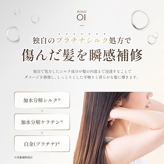 ✅【独自のプラチナシルク】独自でしたシルク成分とアミノ酸が髪の内部まで浸透することでダメージを補修し、美容室帰りのようなしっとりとした手触りと滑らかな髪に導きます。