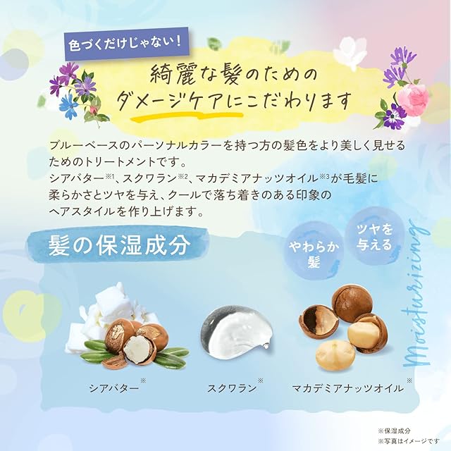 サマーリペア成分(ヒマワリ種子油、ビワ葉エキス、セージ葉エキス)やシルクコラーゲンを配合、夏色のヘアカラーを艶やかに仕上げます。