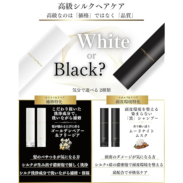 【SILK THE RICH シルクザリッチ】「自宅で続ける高級サロンヘアケア」を目指して開発されました。美容室専売品を超えるクオリティを追求。3種類のシルク成分を配合した髪質補修 シャンプー トリートメントです。メンズ、レディース問わず使える質感と香りで、ダメージヘアはもちろん、においやが気になる方にもお勧めです。