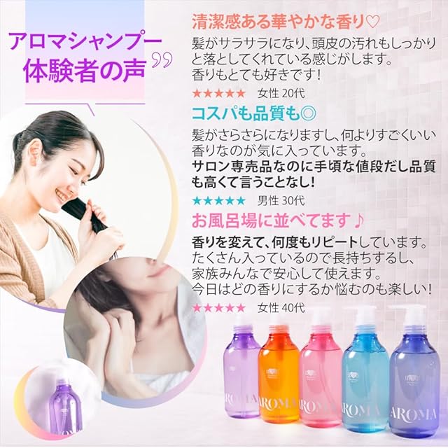 ヘアカラーにパーマ、アイロンでのセットなど様々な髪のおしゃれを楽しむ分、悩みも多い現代人の髪のために。心地いい香りに癒されながら、パサつきや広がりなど日常で起こりやすいダメージをしっかりケア。 豊富なボタニカルエッセンスが髪の芯まで潤いで満たし、ヒートプロテクト成分「エルカラクトン※」がドライヤーの熱に反応し、髪内部に水分や栄養をしっかり閉じ込めます。さらに頭皮環境を健やかに整える植物幹細胞も配合し、地肌もいたわる抜かりないです。 洗うほどに健やかで、指通りのいいサラツヤ髪へ導きます。 好みや気分に合わせて選べる5つの個性豊かな癒しのアロマで、毎日のバスタイムを自分へのご褒美時間に! ※γ-ドコサラクトン