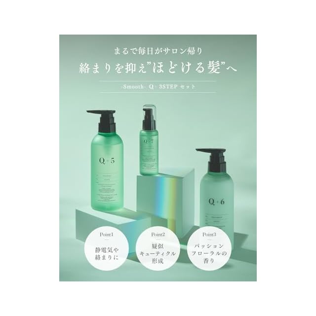 ✨【 サロン品質をご自宅で 】毎日のヘアケアにサロン品質の“クオリティをプラス、Quality + = Q+ ( クオリタス )” ★スムースシャンプー/トリートメント/ヘアオイルの3点セット ー絡まりを抑え "するんとほどける、さらさら髪 " へー