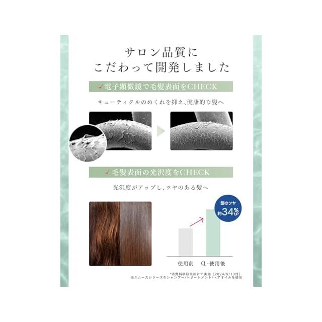 ✨【 毛髪試験*を実施 】✅電子顕微鏡で毛髪表面CHECK ✅毛髪表面の光沢度CHECK 本当に「高品質なのか」を確認するべく、毛髪試験*で調べました。*消費科学研究所にて実施