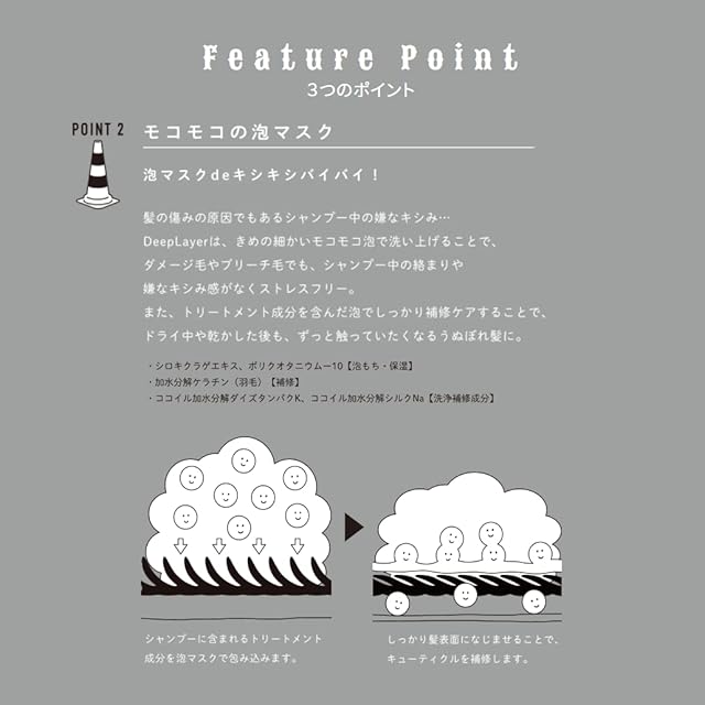 加えてブースター効果により髪表面をなめらかに整え、トリートメント成分を毛髪内部に高浸透させます。圧倒的な補修力で、ダメージ毛やブリーチ毛で絡まり、きしむ髪も、根元から毛先までおさまりの良い髪へと導きます。