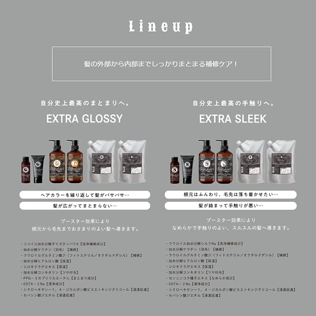 【EXTRA GLOSSY】力と粘性の高いもっちりなめらかな泡質で、洗髪時の髪同士の摩擦を軽減。補修力のある洗浄成分を採用し、さらにトリートメント成分を配合するなどシャンプーにも高い補修機能を持たせています。