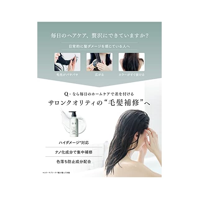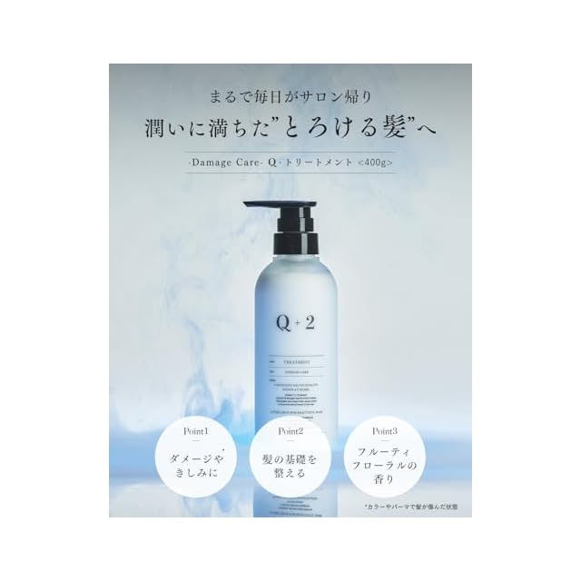 ✨【 サロン品質をご自宅で 】毎日のヘアケアにサロン品質の“クオリティをプラス、Quality + = Q+ ( クオリタス )” ★トリートメント ー内側×外側のWダメージ補修で "なめらかツヤツヤ髪 " へー ✨【 毛髪試験*を実施 】✅キューティクルの美しさをCHECK ✅毛髪表面の光沢度CHECK 本当に「高品質なのか」を確認するべく、毛髪試験*で調べました。*消費科学研究所にて実施 ✨【 ◆トリートメント(Damage Care):加水分解ケラチン(羊毛)配合 】毛髪表面をコーティング。 退色を防止するとともに、なめらかで艶やかな髪へと導いてくれます。 ✨【 洗練された大人の香り ~フルーティ・フローラル~ 】□TOP:アップル・ピーチ・アプリコット・ベルガモット □MIDDLE:ピオニー・ローズ・フリージア・グリーン □LAST:ジャスミン・ホワイトフローラル・スミレ・イリス・ムスク ✨【 毎日のケアをもっとお手軽に 】お得な定期便もご用意しております。