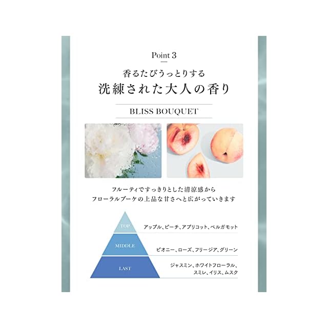 ✨【 洗練された大人の香り ~フルーティ・フローラル~ 】□TOP:アップル・ピーチ・アプリコット・ベルガモット □MIDDLE:ピオニー・ローズ・フリージア・グリーン □LAST:ジャスミン・ホワイトフローラル・スミレ・イリス・ムスク