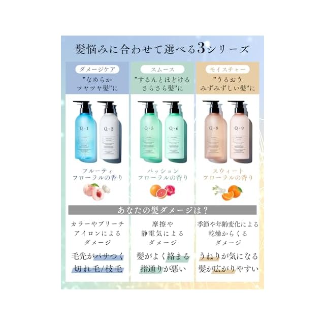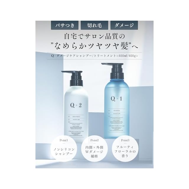 ✨【 サロン品質をご自宅で 】毎日のヘアケアにサロン品質の“クオリティをプラス、Quality + = Q+ ( クオリタス )” ★ダメージケアシャンプー/トリートメント セット ー内側×外側のWダメージ補修で "なめらかツヤツヤ髪 " へー ✨【 毛髪試験*を実施 】✅キューティクルの美しさをCHECK ✅毛髪表面の光沢度CHECK 本当に「高品質なのか」を確認するべく、毛髪試験*で調べました。*消費科学研究所にて実施 ✨【 ◇シャンプー(Damage Care):ノンシリコン・アミノ酸系洗浄成分*1 & 機能性オイル配合 】2種のオイル*2がキューティクルの剥がれを抑制し、トリートメントの浸透性を高めます。 *1:ラウロイルメチルアラニンNa、ココイルメチルタウリンNa *2:PPG-3カプリリルエーテル、ヤシ油脂肪酸PEG-7グリセリル ✨【 ◆トリートメント(Damage Care):加水分解ケラチン(羊毛)配合 】毛髪表面をコーティング。 退色を防止するとともに、なめらかで艶やかな髪へと導いてくれます。 ✨【 洗練された大人の香り ~フルーティ・フローラル~ 】□TOP:アップル・ピーチ・アプリコット・ベルガモット □MIDDLE:ピオニー・ローズ・フリージア・グリーン □LAST:ジャスミン・ホワイトフローラル・スミレ・イリス・ムスク 「B0BVFVR9DF」と「B0BVFVJ385」のセット商品です。