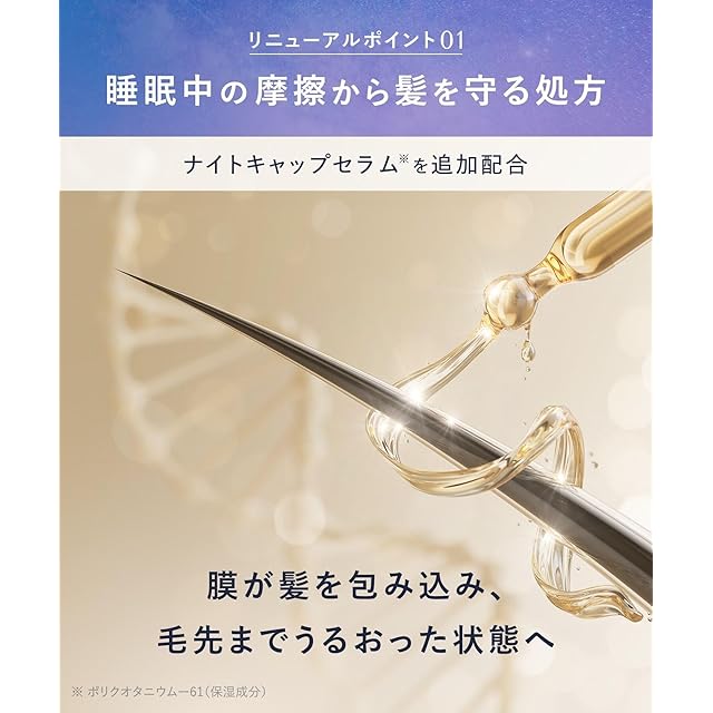 夜間美容で、扱いやすいしっとり髪へ 髪の内側から毛先まで濃密集中補修 [モイスチャーナイトリペア] ナイトセラミド※1 キューティクルをしパサつきケア CMC類似補修成分※2 蓄積した髪ダメージを補修 + 睡眠中の摩擦ダメージから髪を守る ナイトキャップセラム※3 髪をコーティングして睡眠中の摩擦を軽減し髪を保護 地肌に潤いを与える夜間美容成分配合 チャボトケイソウエキス※4 ネムノキ樹皮エキス※5 ハス花エキス※6 安らぎたい夜にネロリ&ピオニーの香り ※1 セラミドNG(成分) ※2 ラウロイルグルタミン酸ジ(フィトステリル/オクチルドデシル)(毛髪補修成分) ※3 ポリクオタニウムー61(成分) ※4※5※6 全て成分 パラベン、鉱物油、合成着色料フリー