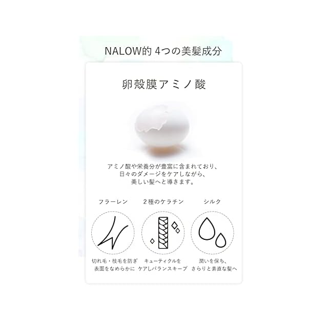 ✅【内側からケア】人の肌や髪に近いたまご由来の「卵殻膜アミノ酸」配合しています。豊富なアミノ酸と成分がキューティクルまですばやく浸透し、ダメージを内側からケアします。