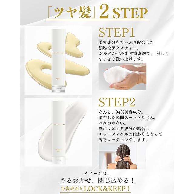 【美容液のような濃厚テクスチャー&濃密泡】シャンプーはとろみの強いテクスチャーで、きめ細かくしっかりめのもち泡が特徴。ヘッドスパに行ったように頭皮と髪の毛を包み込み、気持ちよく洗い上げます。トリートメントは硬めのテクスチャーながら、塗布した瞬間にすっと吸着浸透。熱に反応して髪の毛をコーティングします。
