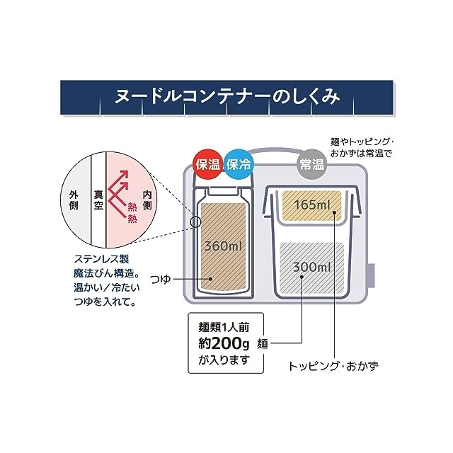 容量:スープジャー/360ml、樹脂容器/300ml(麺類1人前の約200gが入ります)、トッピング・おかず/165ml