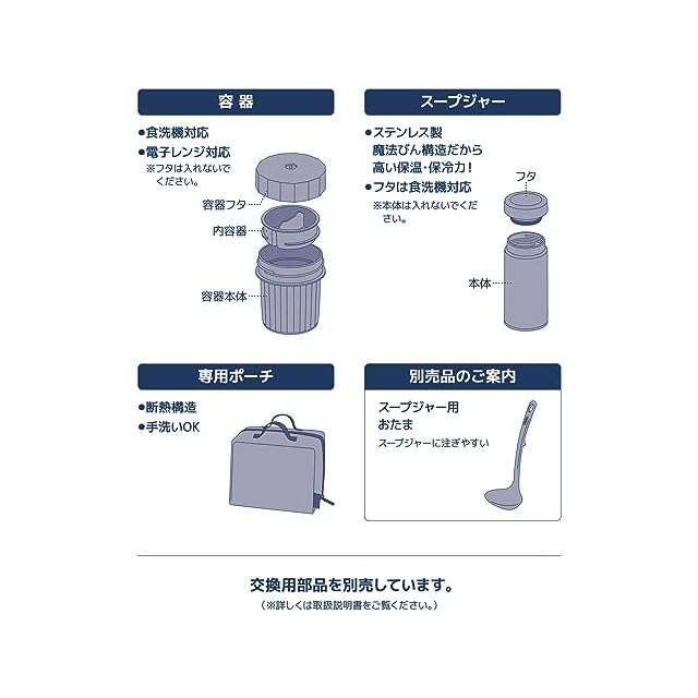 素材・材質:保温ケース/ステンレス鋼 (アクリル樹脂塗装)、ごはん容器本体/ポリプロピレン、ごはん容器フタ/ポリプロピレン (発泡ポリプロピレン内蔵)、おかず容器本体/ポリプロピレン、おかず容器フタ/シリコーンゴム、ハシ/飽和ポリエステル樹脂、ハシケース/ABS(アクリロニトリル・ブタジエン・スチレン)樹脂素材・材質:【スープジャー】本体:ステンレス鋼(アクリル樹脂塗装) / フタ:ポリプロピレン(発泡ポリプロピレン内蔵) / パッキン:シリコーンゴム / 【容器】本体:ポリプロピレン / フタ:ポリプロピレン / フタパッキン:シリコーンゴム / ベン:シリコーンゴム / 内容器:ポリプロピレン 【ポーチ】外生地:ポリエステル / 内生地:ポリエステル / クッション(断熱材):発泡ポリエチレン