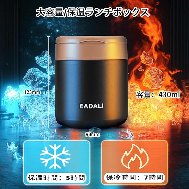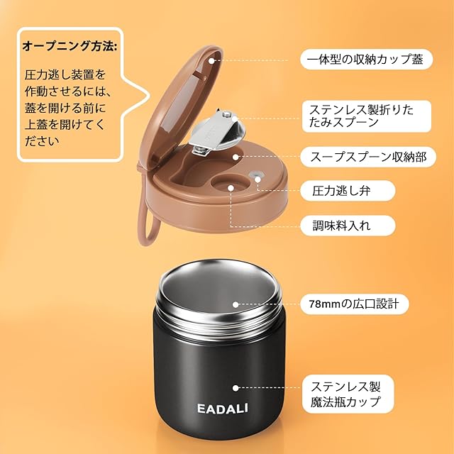 商品名:[EADALI]【真空断熱構造】スープジャー 430ml ブラック 子供から大人まで使える 保温保冷 SUS316製 広口設計 食洗機対応モデル 折りたたみスプーン付き お手入れ簡単 弁当箱