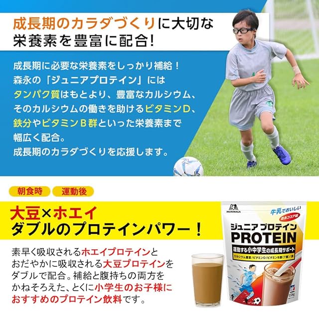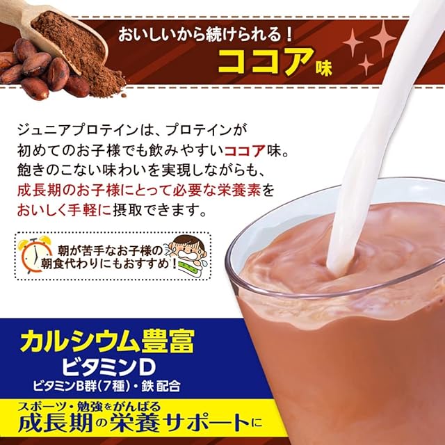 特徴: 【成長期の栄養サポートに】 スポーツ・勉強をがんばる成長期のお子様に必要な栄養素を豊富に配合したプロテイン。森永ココア使用。合成甘味料不使用。