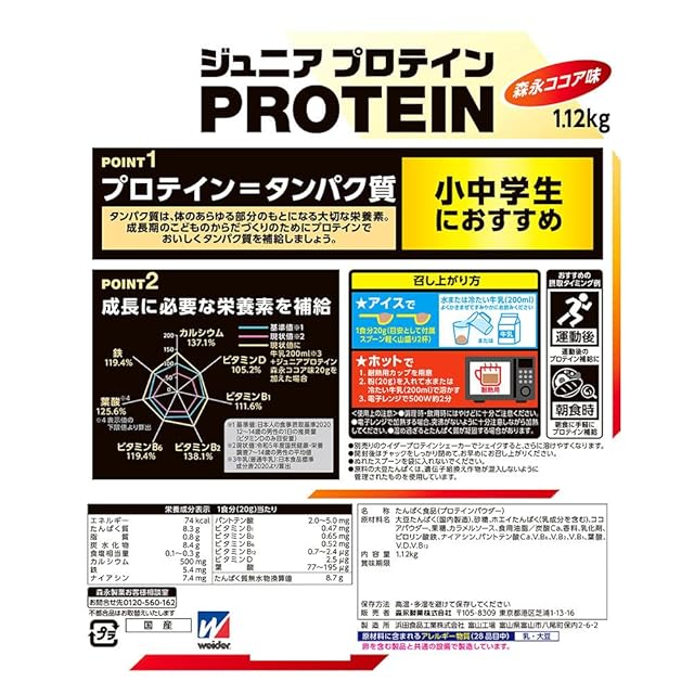 商品名:森永製菓 ジュニアプロテイン ココア味 1.12kg ウイダー ソイ ホエイ カルシウム ビタミン 鉄分 合成甘味料不使用 アンチドーピング 国産【Amazon 限定】