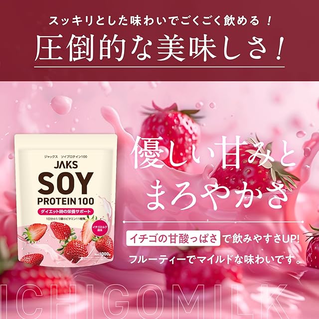 JAKS ジャックス ソイ プロテイン1kg 国内製造 おいしい ダイエット ビタミン 高濃度ソイプロテイン 高たんぱく質 粉末 大豆たんぱく 溶けやすい ぷろていん (1kg, イチゴミルク)