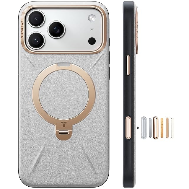 TORRAS iPhone 17 Pro Max 用 ケース【新感覚レザー・スキンタッチ】Ostand Q3 レザートーン MagSafe対応 リング スタンド 360°定点回転 縦横両対応 マグネット搭載 革 カメラコントロールボタン 米軍規格 耐衝撃 指紋防止 パール・グレー