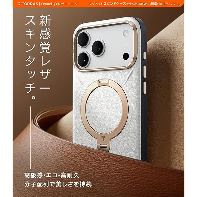 TORRAS フラッグシップ・ハイラグジュアリー「Ostand Q3 レザートーン」は、品質と格調を求める都市エリート・ファッション先駆者のために生まれた。「パール・グレー」は、ミニマリストに捧ぐ「高級な下地」。柔霧感レザーが真珠の繊細な輝きを放ち、天然テクスチャーに霜雪のような深みがあり、光と影で層次を描く。シャンパンゴールドリングが冷グレーに温もりを添え、あらゆる場面で「目立たずとも引きつける」アクセントとなり、「侘寂」の余白哲学を伝える。*カメラコントロールボタン付き 対応機種:For iPhone 17 pro max ケース