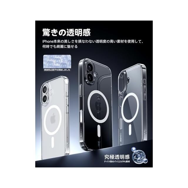 【PC背面・黄変防止】高品質のPC素材とドイツ製のバイエルTPU素材を使用し、傷がつきにく透明度の高いPC背面がiPhone 17の洗練された本来の美しさを保ちます。TPUポリマーには新たに開発したUV剤が配合されており、ケースの黄変防止性能が大幅に向上。長期間使用しても光沢と透明感を維持することができます!さらにPC素材は耐衝撃性が高く、アクリル素材のおよそ30~50倍です。落下衝撃時にはPC素材が優れた保護性能を発揮するが、アクリル素材は割れやすい。