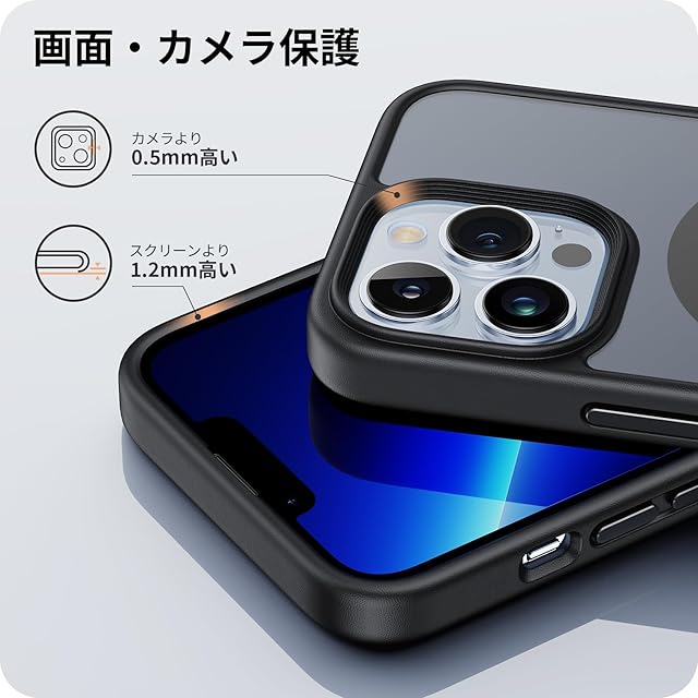 【細部までも保護】カバーの縁はアイフォン13pro の液晶画面より1mm高く、カメラレンズより0.7mm高い、併用の保護ガラスフィルムで平置きしても画面は接触しない、細部までの保護も配慮され、より一層な安心感を与えられます。
