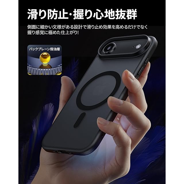 【半透明・マット仕上げ】背面は耐久性や耐摩耗性に優れたポリカーボネート使用。表面には指紋防止ナノコーティングを施しており、指紋がつく心配もありません。マットな質感でサラサラした触り心地。背面は半透明なので、リンゴマークが透けて見えるようになっています。高級感も併せ持ったケースです。また、いPhone Airケースはカメラコントロールカバー付き。iPhone17シリーズからのカメラコントロールボタンに対応しています。