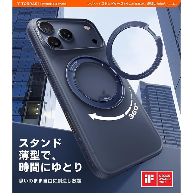 TORRAS iPhone 17 Pro Max 用ケース 【カチカチ・多機能360度回転スタンド】リング Ostand O3 Fitness MagSafe対応 米軍MIL規格耐衝撃 スタンド 指紋防止 黄変防止 カメラコントロールボタン付き ストラップホール 半透明 撮影/動画視聴/日常の記録 手のひらサイズの映像革命 ブルー