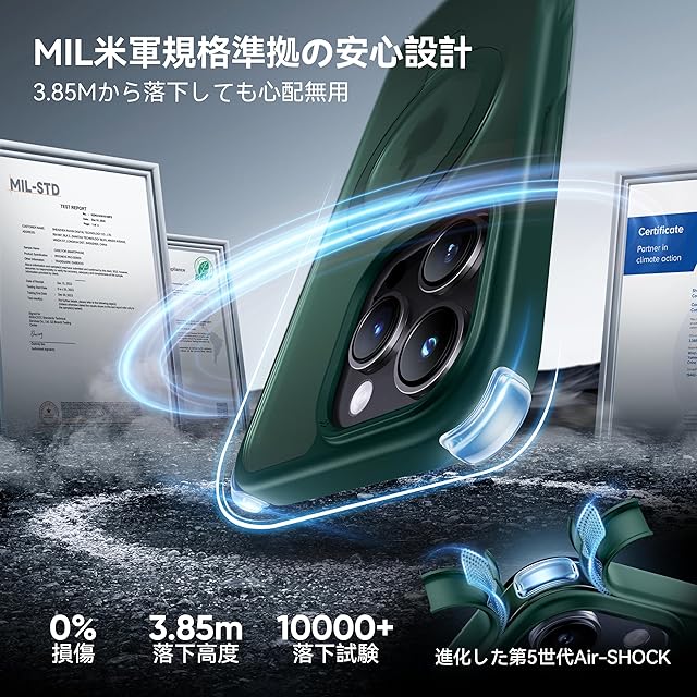 【MIL米軍規格取得・驚異の防御!】業界高レベルの硬度と耐衝撃度を実現。3.85Mから落下させてもスマホ本体は綺麗に無傷!過酷な米国国防総省の耐衝撃試験「MIL-STD-810G」認証クリアし、特別な振動低減技術と三重耐衝撃構造、ケースの四隅に進化された第5世代AIR‐SHOCHを搭載することにより、衝撃吸収性能を20倍アップ!どのような角度の衝撃に対しても受け止めて大切なスマホをしっかりと保護!また、側面にだけの滑り止め設計により、ホールド感が高まり、春から夏にかけて手汗が濡らしても滑りにくい。米軍MIL認証番号:GZMR240702237705|認証機関:CSTC Standards Testing Center | 認証時間:Jul 20, 2024